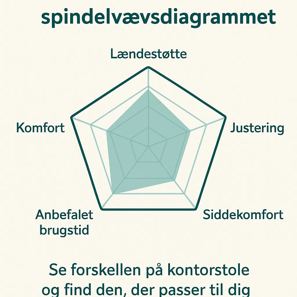 Brug diagrammet som din hurtige genvej: se på ét blik hvor stærk en stol er på støtte, justering, komfort, brugstid og pris. Jo større flade, desto mere alsidig stol – men det bedste valg afhænger af dine behov.