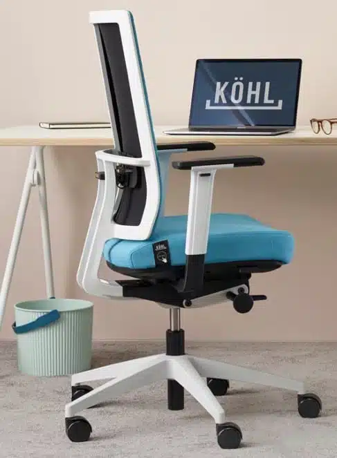 Mesh stol til lange arbejdsdage. Den har et KOEHL® Air-Sæde, der aktivt bidrager til sund sidestilling.